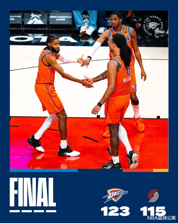然而,OKC稳扎稳打还是顶住了对手的攻势。最终,雷霆以123比115险胜过关,得以豪取12连胜。雷霆开季已经取得了20胜1负的战绩,这让他们成为NBA历史上第四支赛季开局取得20胜1负或更好战绩的球队。