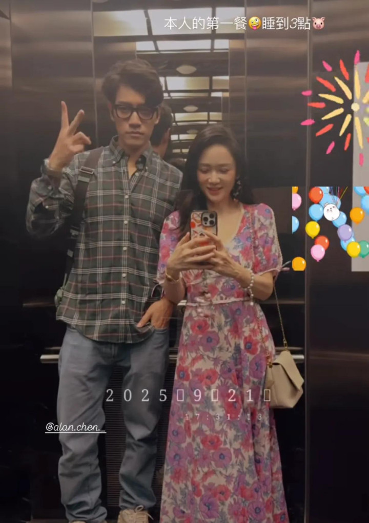 照片中,陈乔恩化着精致妆容,披着一头长直发,身穿红色印花长裙,搭配花朵耳坠,真的好美。老公Alan身穿蓝色格纹衬衫,打扮简单也很显帅气。两人在电梯里自拍,陈乔恩负责拿手机,Alan对镜比剪刀手,两人互动有爱。陈乔恩还留言称自己睡到三点,晚餐就是第一餐呢,看来晚上的大餐可以放心吃不怕胖了。