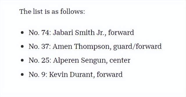 ESPN公布了新赛季100名球员榜单,其中杜兰特第9,森贡第25,阿门第37。