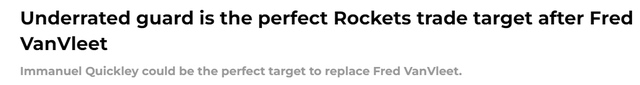休城媒体《spacecityscoop》建议火箭总经理斯通交易得到奎克利,让他担任首发控卫,顶替范乔丹。