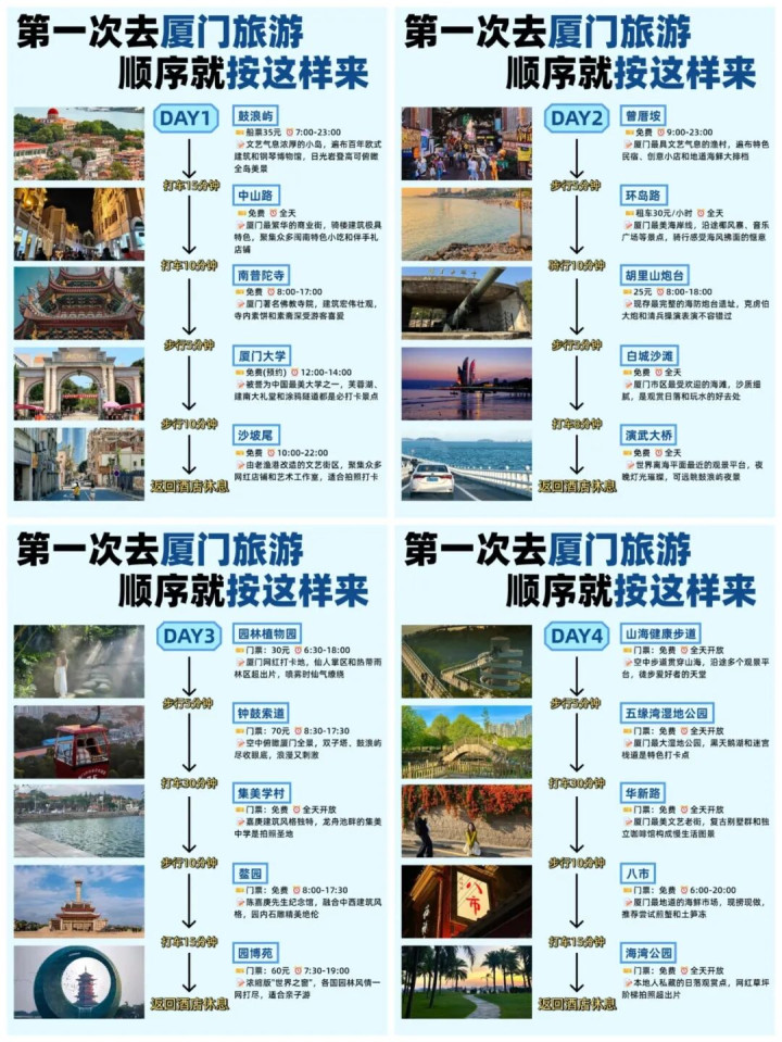 交通攻略:飞机直达厦门高崎国际机场/厦门翔安国际机场,高铁直达厦门站/厦门北站;去鼓浪屿需从厦门轮渡码头乘船。