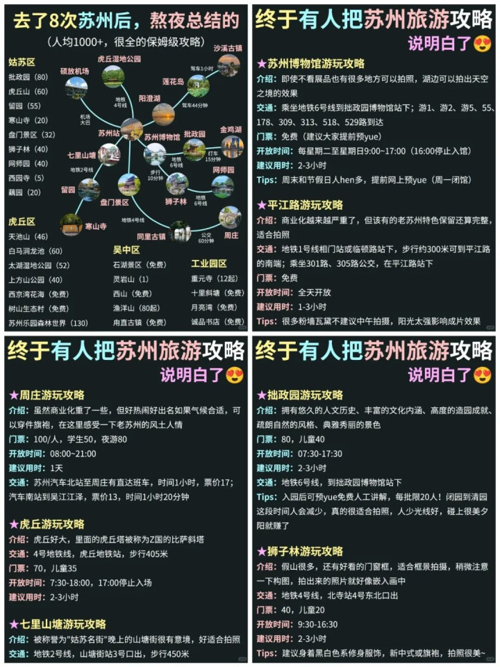 交通攻略:高铁直达苏州站/苏州北站;市内地铁、公交便捷,去古镇可乘坐旅游专线或大巴。