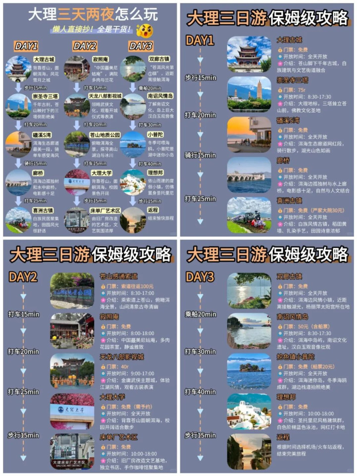 交通攻略:飞机直达大理凤仪机场,高铁直达大理站;市内可租车、骑行或乘坐景区直通车。