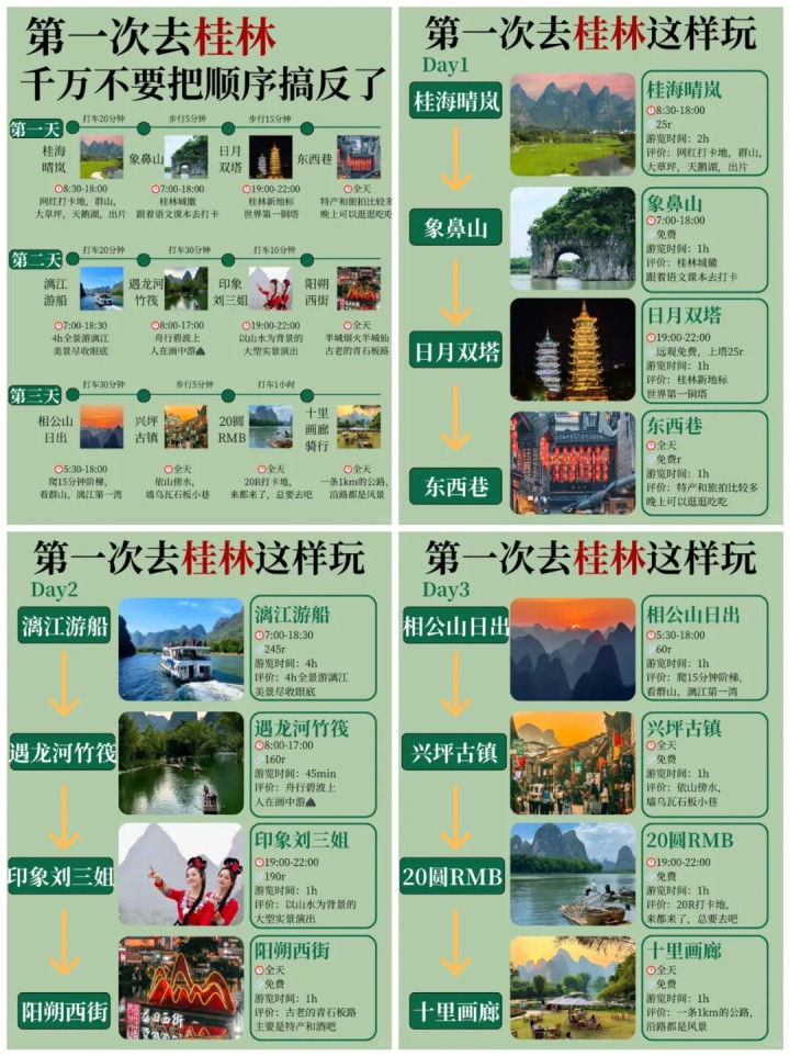 交通攻略:飞机直达桂林两江国际机场,高铁直达桂林站/桂林北站;市内公交、出租车便利,去阳朔可乘坐大巴或游船。