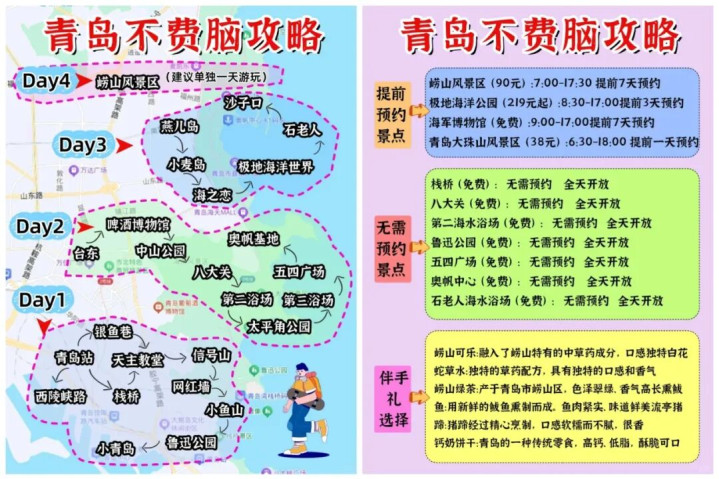 交通攻略:飞机直达青岛流亭国际机场,高铁直达青岛站/青岛北站;市内公交、地铁便利,沿海区域步行或骑行更佳。